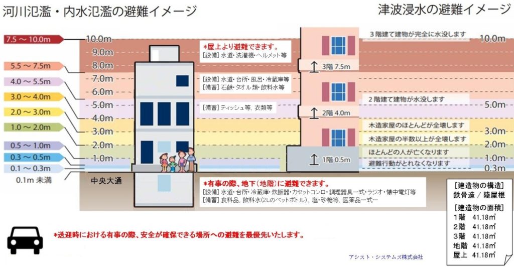 浸水時は、状況に応じて2階、3階または屋上へと避難をいたします。